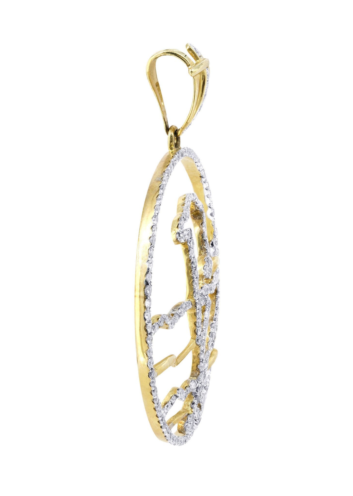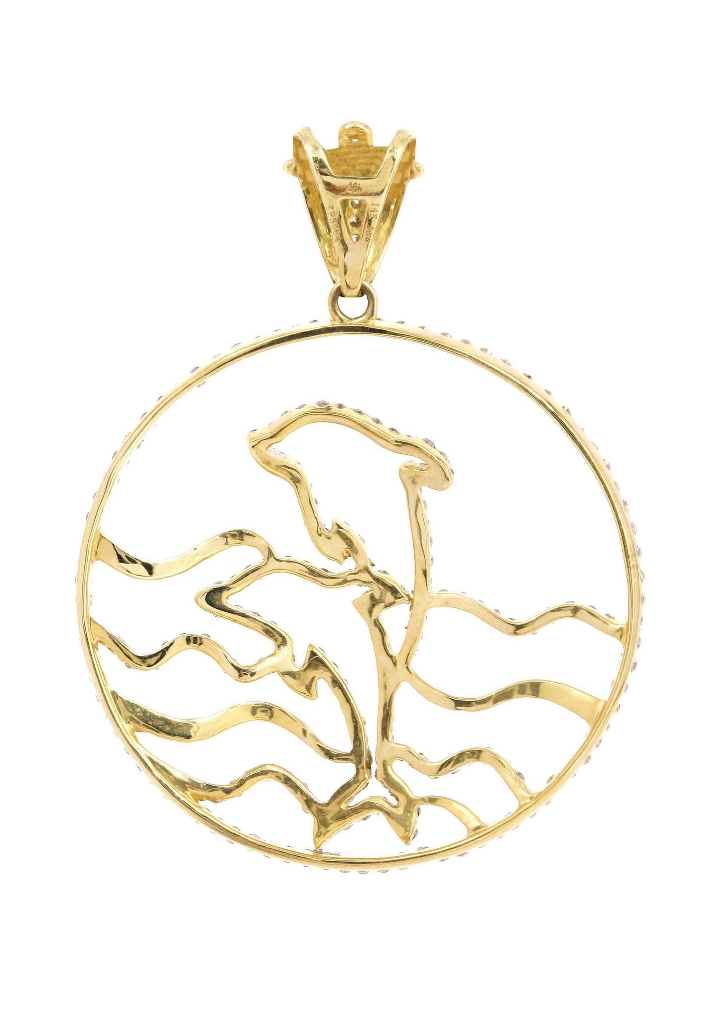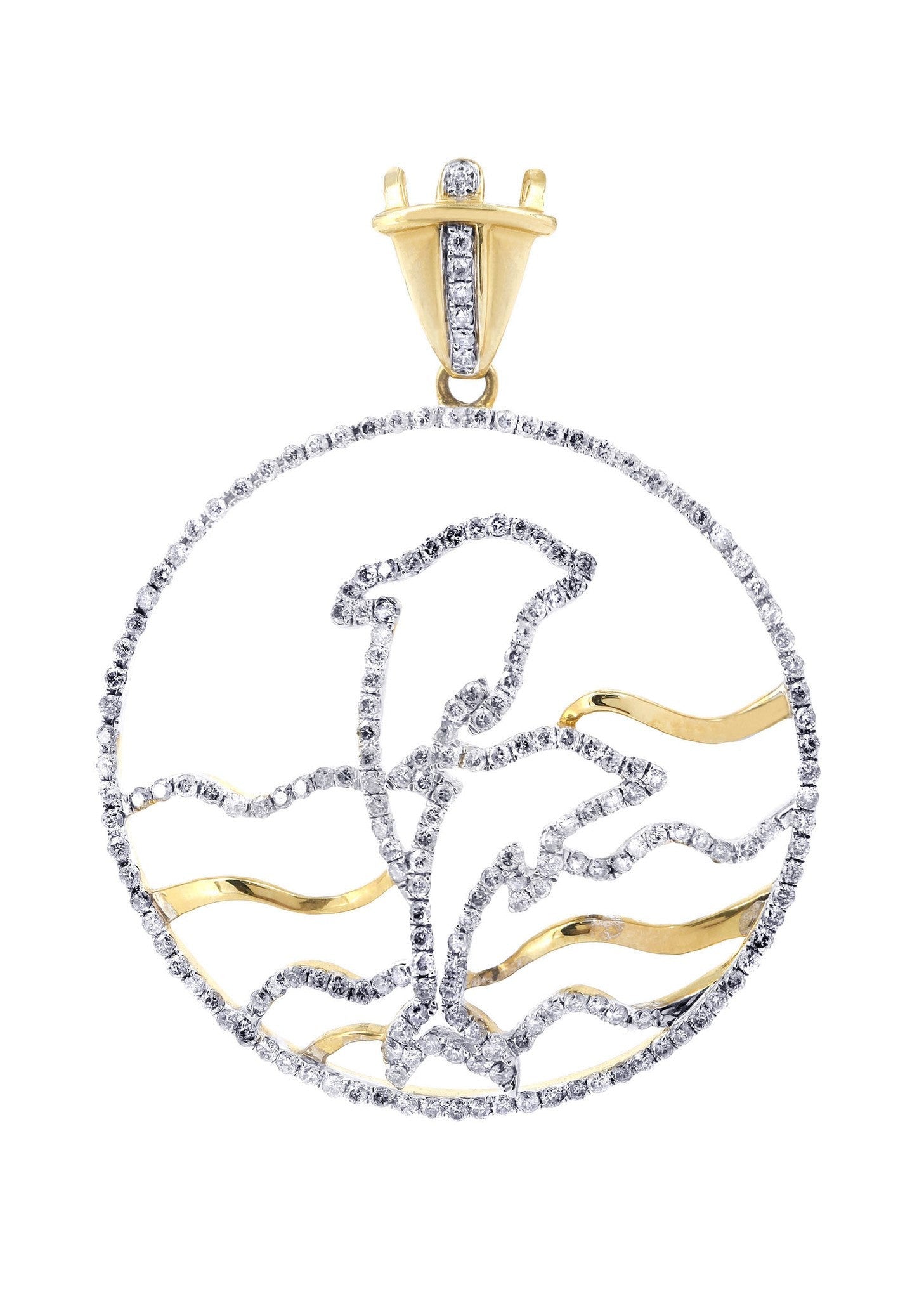14K Yellow Gold Dolphin Pendant With Approximately 1.59 Carats Of Colorless / Near Colorless Eye Clean quality Diamonds And 5.85 Grams. This Pendant Has An Average Length Of 47 Mm And A Width Of 36 Mm.